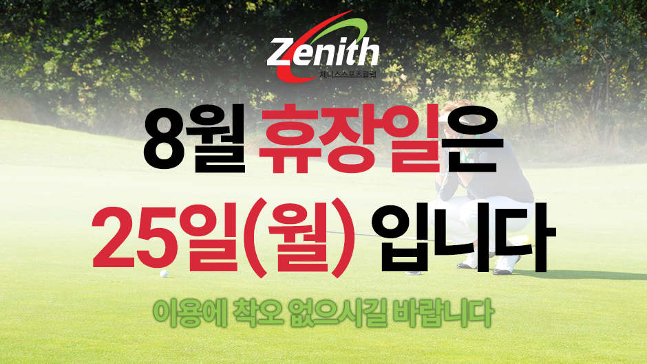 홈 > Event > 이벤트 이벤트 제목 2025년 8월 휴장일 안내 이름 제니스스포츠클럽 (날짜 : 2025-08-13 오후 2:09:49 // 조회 : 288) 2025년 8월 휴장일은마지막주 월요일인 8월 25일입니다. 이용에 착오 없으시길 바랍니다.감사합니다. 첨부 첨부1 : t03-20250813-ClosedDays.png 다음 글 : 2025년 9월 휴장일 안내 이전 글 : 2025년 7월 휴장일 안내