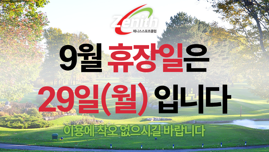 홈 > Event > 이벤트 이벤트 제목 2025년 9월 휴장일 안내 이름 제니스스포츠클럽 (날짜 : 2025-09-12 오후 3:46:20 // 조회 : 358) 2025년 9월 휴장일은 마지막주 월요일인 9월 29일입니다. 이용에 착오 없으시길 바랍니다. 감사합니다. 첨부 첨부1 : t03-20250912-ClosedDays.png 다음 글 : 2025년 10월 휴장일 안내 이전 글 : 2025년 8월 휴장일 안내